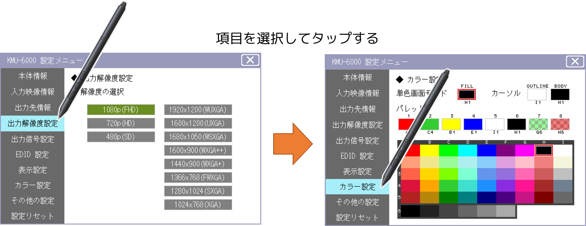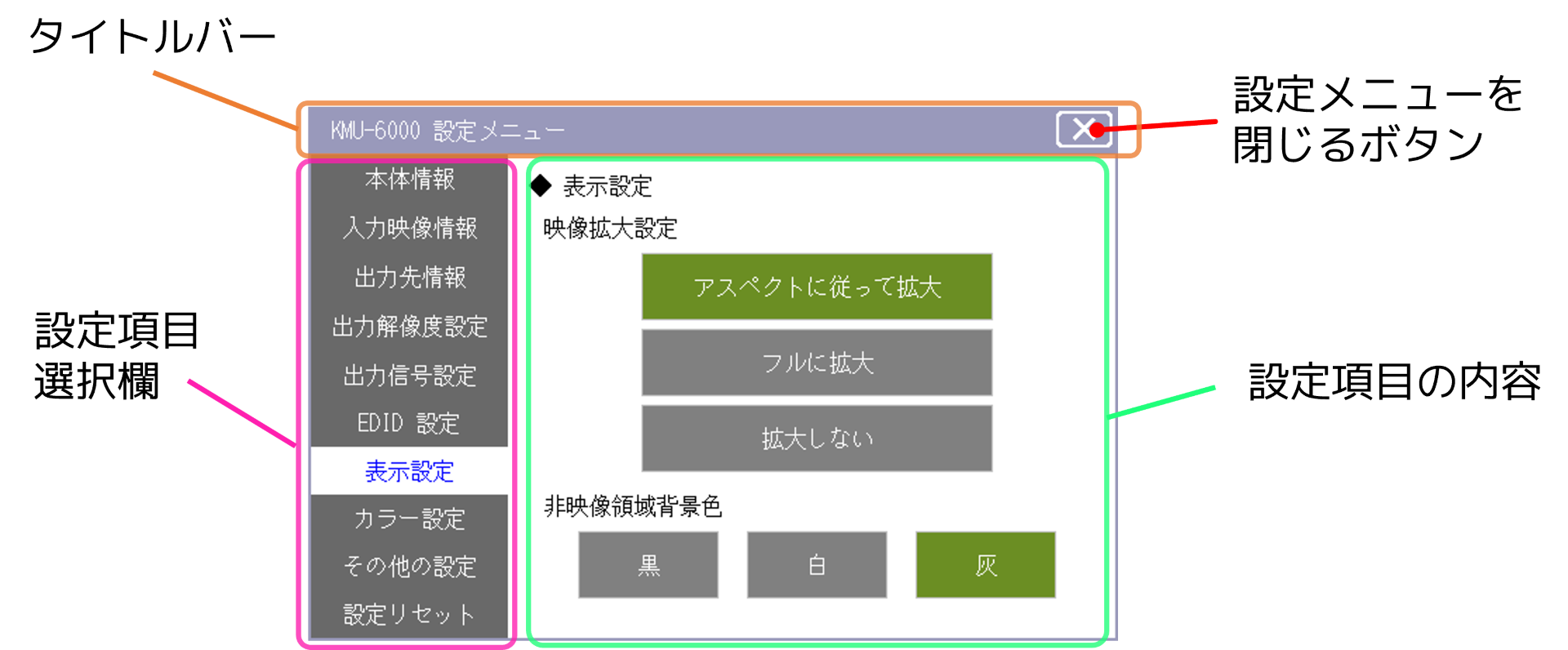 設定メニューは複数の項目からなり、設定メニュー項目を選択(マウスでクリック、または、ペンでタップ)することで設定ページの内容が切り替わります。