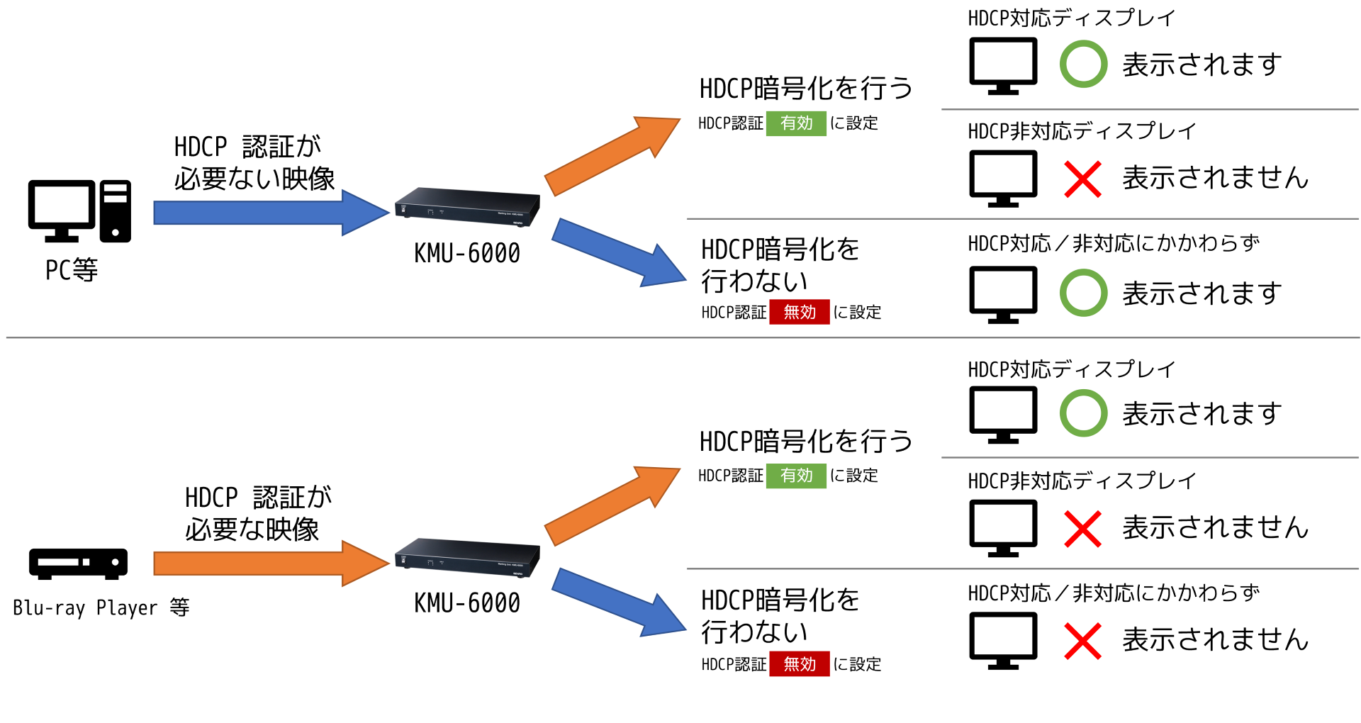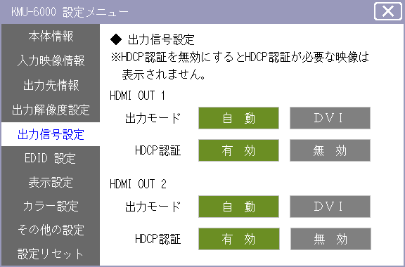 KMU-6000と出力先機器(ディスプレイ等)間で HDCP 認証を行うか設定します。「有効」ボタン、または、「無効」ボタンを押して切り替えます。