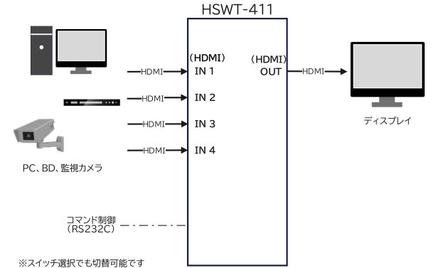 ⾳声ミキシングやHDMI分配器との併⽤に対応・音声入力端子を備え、選択されたHDMIの音声とミキシングして出力することが可能です。・当社HDMI2分配器SPLH-200や4分配器SPLH-400との併用で複数のモニタに同時出力することが可能です。 |