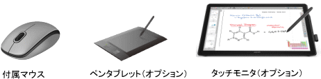 描画方法はマウス、ペンタブレット、タッチパネルに対応描画方法はマウス(付属)、ペンタブレット(別売)、液晶タッチモニタ(別売※)から選択が可能です。液晶タッチモニタをご利用頂くことで、より直観的に描画することができます。![]() ※液晶タッチモニタは動作検証済みの製品がございます。当社営業部までお問い合わせください。 |