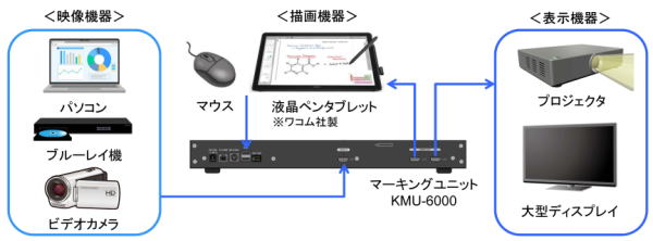 様々なデジタル機器の映像に描画ができるハードウェア方式KMU-6000はソフトウェアのインストールが不要なハードウェア方式のマーキングユニットです。スイッチャーからの出力映像、パソコン、ブルーレイプレーヤー、ビデオカメラなど、様々なデジタル機器の映像に描画を行うことができます。授業、会議、講演会、セミナーでのご利用に最適です。 |
