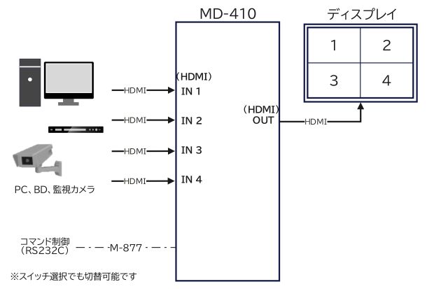 完全ハードウェア方式の画面分割表示に対応MD-410はパソコンやAV機器の画面を1台のモニタで画面分割表示(マルチ表示)および切替選択ができる業務用のHDMIセレクターです。従来のアナログRGB信号やビデオ信号とことなり、FULLHD(1920×1080ドット)の解像度の画像を劣化させることなく、鮮明に表示することができます。 また、画面分割表示機能は完全ハードウェア方式を採用し、ソフトウェアをインストールする必要がありません。ケーブルをつなげばすぐに使用することができます。 ![]() |