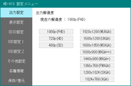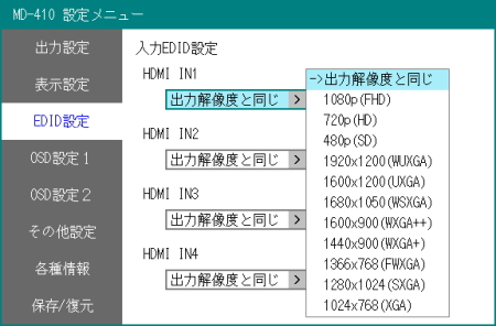 様々な入力/出力解像度の設定が可能MD-410は設定したEDID情報を入力機器に返す機能を備えています。入力機器のON、OFFなどで出力解像度が異なってしまうなどのトラブルを回避することができます。 |