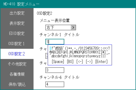 入力映像のチャンネル名を表示(OSD機能)入力画像に表示するチャンネル名(最大8文字)を数字、アルファベットから選択することができます。オフィスや工場で監視用途で使用する場合にパソコンやカメラの名前などで表示させておくと、一目で画像の種類を区別することができます。 |
