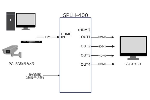外部接点コントロールにより映像出力のON、OFFが可能・分配した映像をチャンネル毎に表示、非表示を制御することができます。・必要なモニタだけに表示できるので、工場やデジタルサイネージなどの分野で効果を発揮します。 |