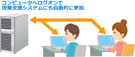 | <LDAP連携による学習者管理> Windowsのログオン情報を取得し、出席情報や授業支援メニュー上の氏名表示に利用することができます。 ![]() |