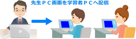 | <画面転送配信> 先生PC画面や選択した学習者のPC画面を一斉または個別に学習者のPC上へ配信することができます。 配信画面サイズは全画面、1/4サイズを指定することができます。 ![]() |